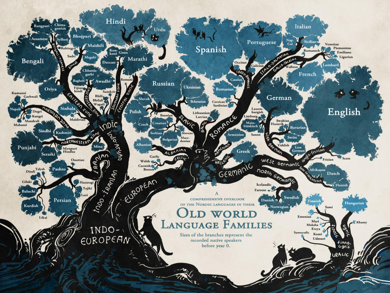 It was made by talented Minna Stunberg, a Swedish-Finnish female artist. She made this image for her most famous graphic novel, Stand Still Stay Silent, and gained so much popularity among linguists for its efficient display of the Indo-European family (as well as the Uralic family). You can find its full version here.Also, on another note, I used Wikipedia and other sources for non-European languages and number of speakers.